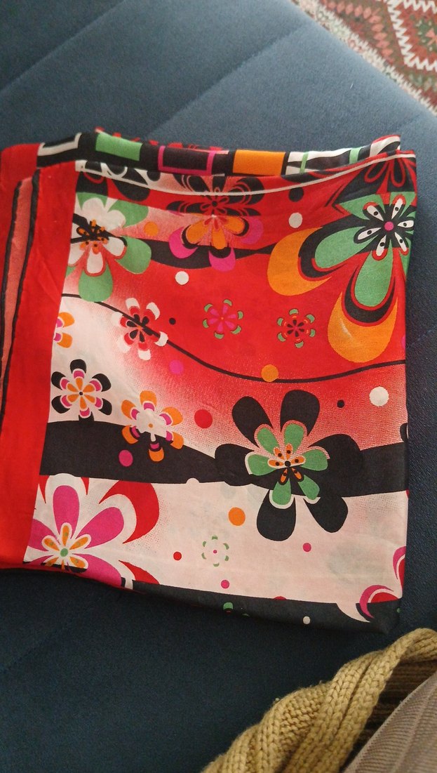 Canlı çiçek desenleriyle renkli, drapeli kadın fular. Bohem, hippie ve retro tarzlara uygun, yumuşak ipek kumaştan yapılmıştır. kullanma bağlı iğne izleri mevcut