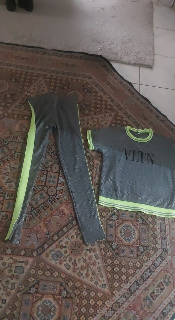 V yaka uzun kollu üst ve midi boy pantolondan oluşan, gri ve neon yeşil detaylı, baskılı VLTN logolu, sentetik kumaşlı kadın eşofman takımı. ♀️
