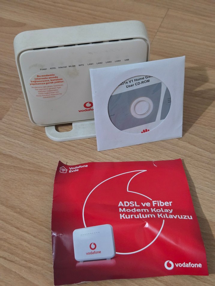 Beyaz Vodafone modem, kullanıcı CD'si ve ADSL ile fiber bağlantılar için kırmızı kurulum kılavuzu içerir.