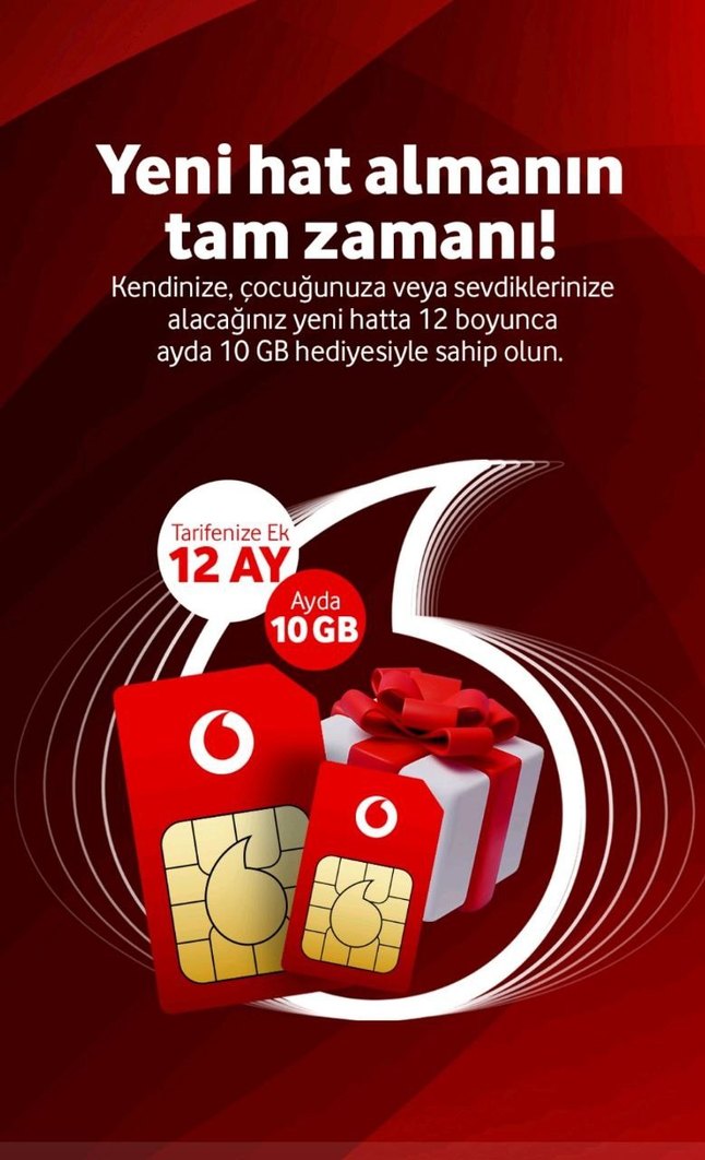 Yeni hat alımında 12 ay boyunca ayda 10 GB hediye data sunan kırmızı Vodafone SIM kart. Kendiniz veya sevdikleriniz için uygun. Turkcell Vodafone açık hat var turktekom açık hat var