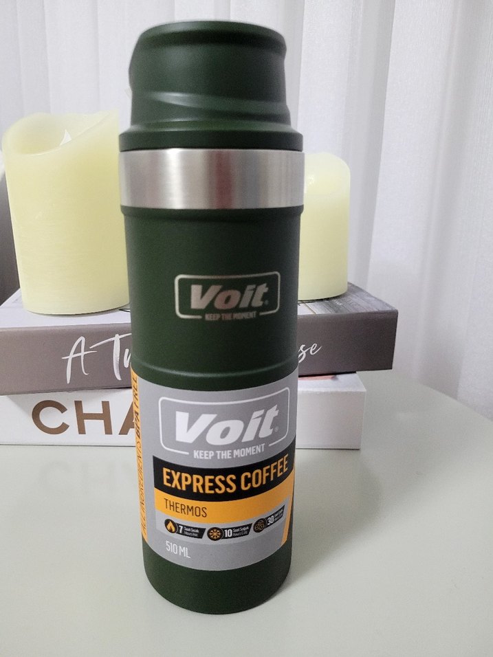 Voit Express Coffee termos, 510 ml hacimli koyu haki renkte, içecekleri saatlerce sıcak veya soğuk tutar. Güvenli kapak ve dayanıklı tasarıma sahiptir. ☕