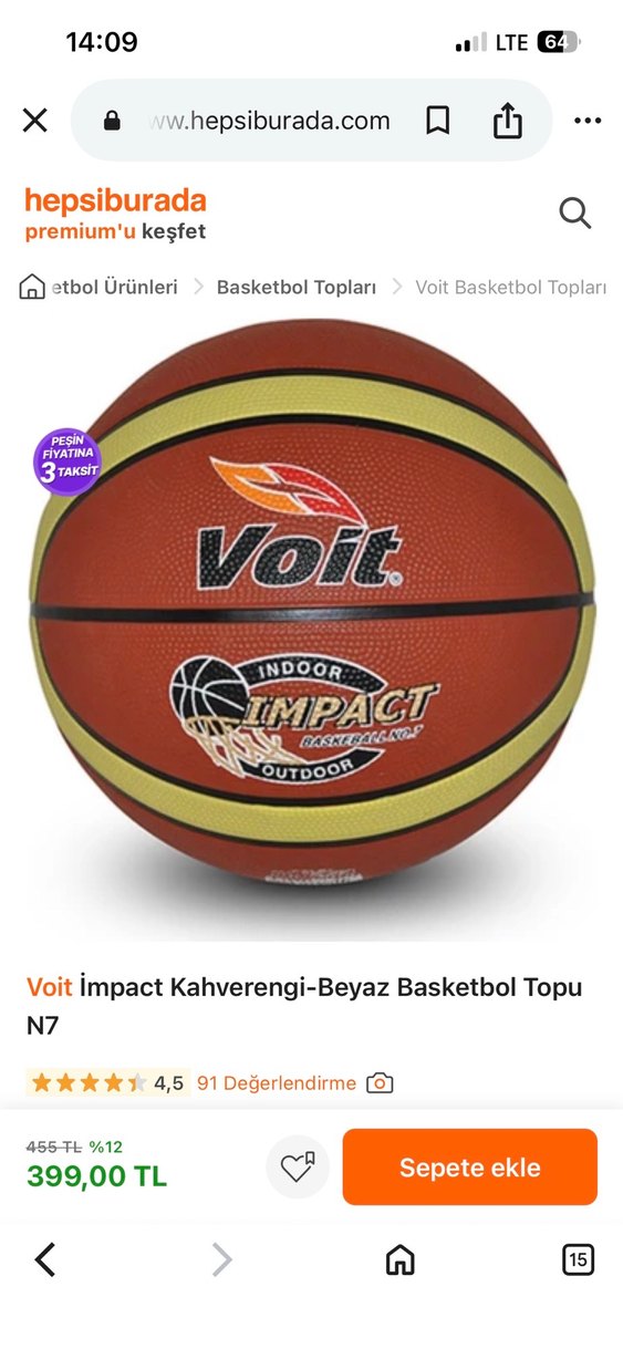 Voit Impact basketbol topu, kahverengi ve beyaz renklerde, dayanıklı kauçuk malzemeden üretilmiştir. Hiç şişirilmedi