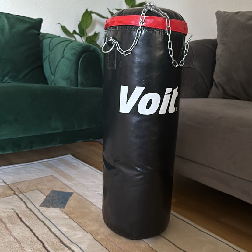Boy 69cm. Çap 80cm.Zincir detaylı, siyah deri boks torbası. Üzerinde Voit baskısı bulunur ve gotik athleisure tarzındadır.