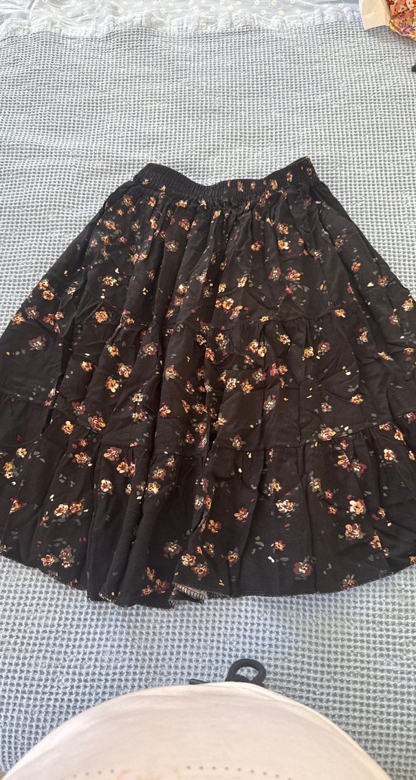Volan detaylı, bol kesim bohem midi hamile eteği, yumuşak sentetik kumaştan, günlük kullanım için uygun, koyu çiçek desenli. Boy 55