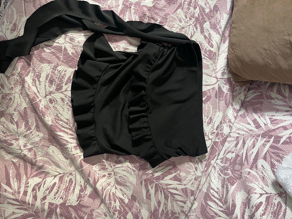 Sentetik kumaştan yapılmış, volan detaylı, siyah mini hamile eteği. Gevşek kesimi ve gotik tarzıyla günlük kullanıma uygundur.
