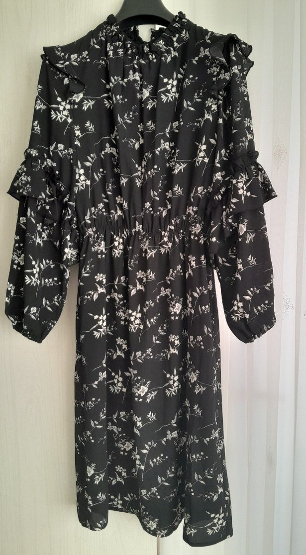 Volan detaylı, uzun kollu, yüksek yakalı bol kesim midi boy elbise. Parisli gotik stilinden esinlenen desenli koyu kumaştan, günlük kullanıma uygun.