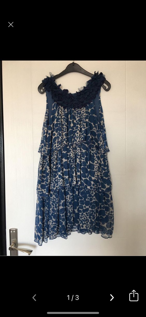 Volan detaylı, askısız, midi boy lacivert ve gri batik desenli bohem elbise. Rahat kesimi ve tarzıyla günlük kullanıma uygundur.