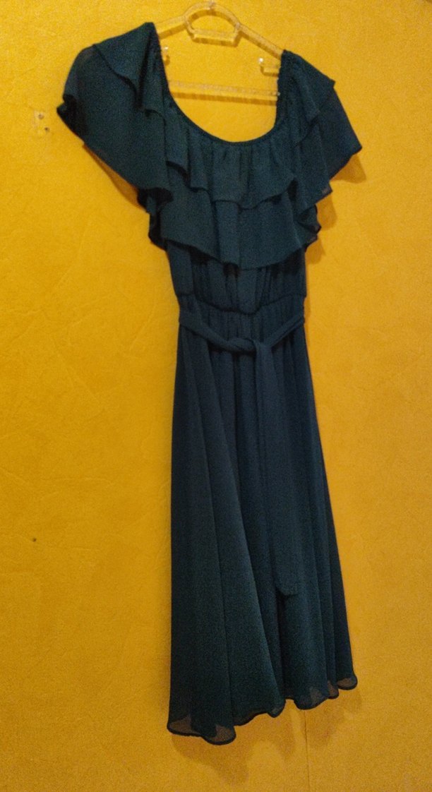 Günlük giyilecebilecek harika bir elbise 38 40 bedene uygun Mavi uzun elbise, kayık yaka ve askılı kollara sahip. Volan detayları ve desenli tasarımıyla düğünler için uygun, bol kesim.