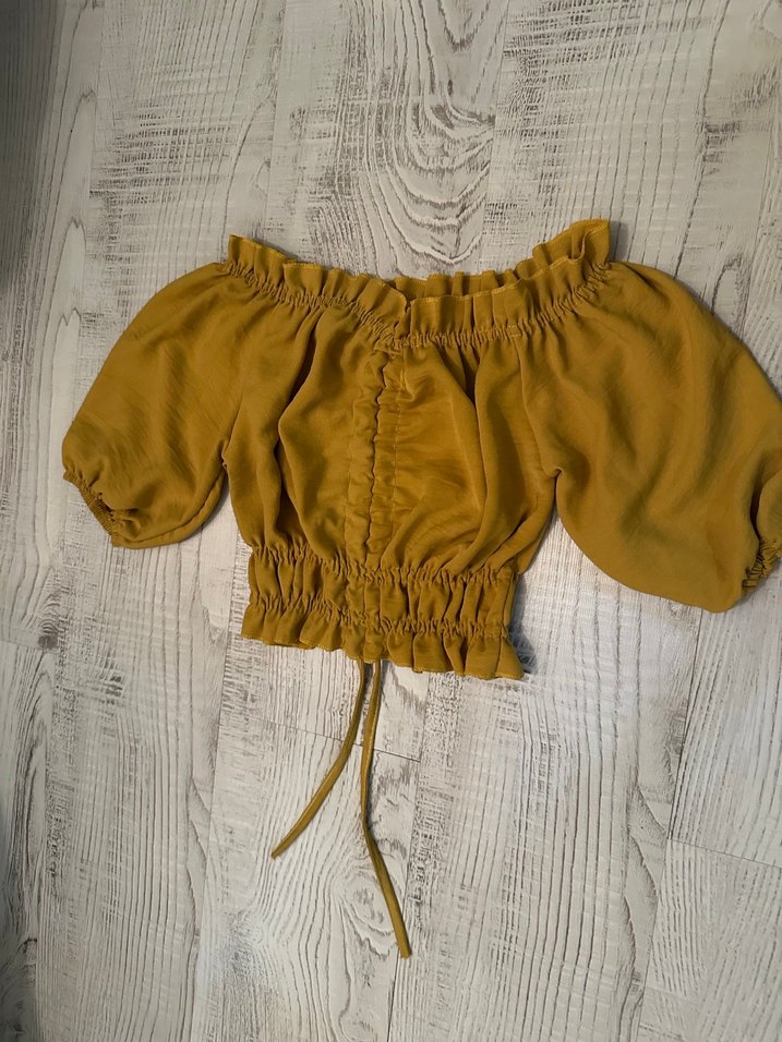 Bol kesim, tek renk bej kadın bluz, tekne yakalı ve volan detaylıdır. Kısa, askılı kollara sahiptir ve parlak renktedir.