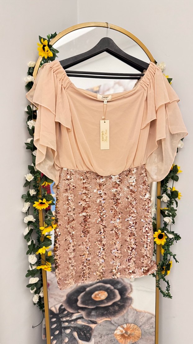 Bej renkli, straplez yaka ve volanlı kısa kollara sahip, bol kesim mini elbise. Etek kısmında desenli payet detayları bulunur, parti için uygundur.