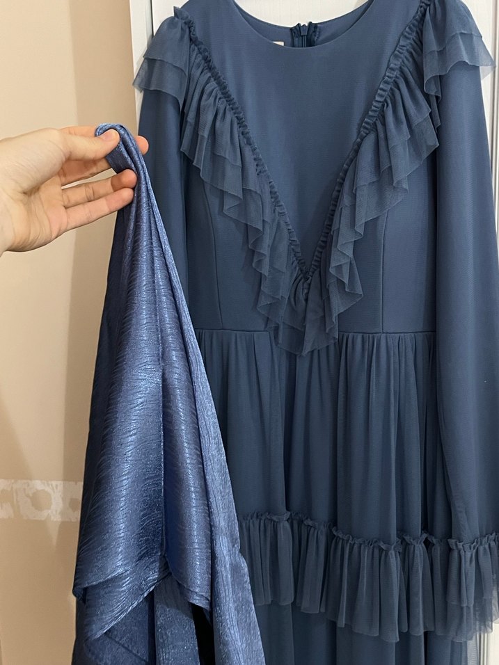 Astarlı şifon kumaştan, uzun kollu ve katlı etek tasarımlı tesettür elbise. Fırfır detaylarına sahiptir. Şalı da mevcuttur.