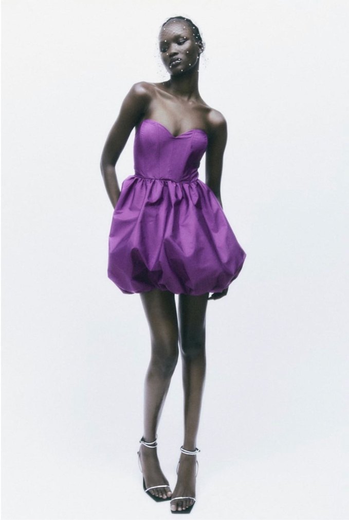 Mor saten kumaştan yapılmış, straplez yaka ve drapeli tasarıma sahip, vücuda oturan midi elbise. Güncel parti stilleri için uygun.