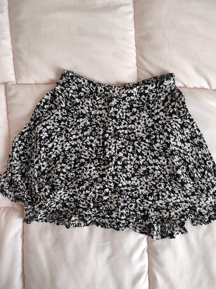 Pamuk kumaştan, siyah beyaz çiçek desenli, volanlı ve bol kesim mini etek. Rahat dış mekan kullanımı için uygundur.