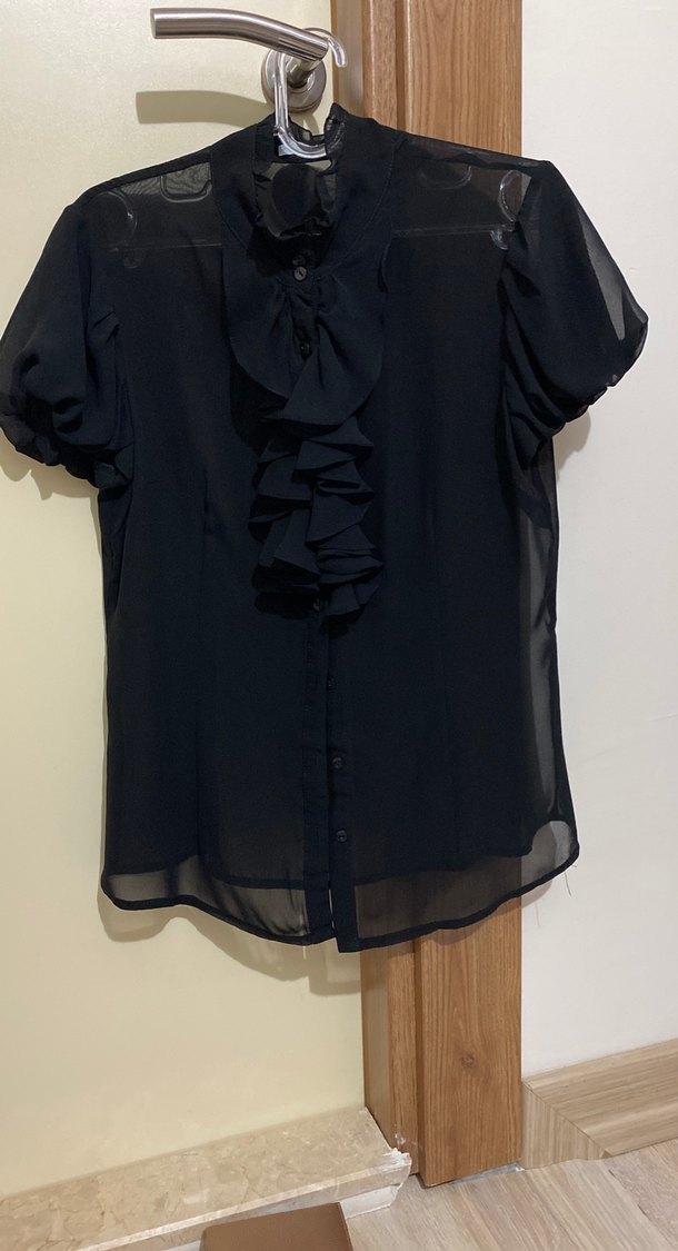 Şifon , kısa kollu siyah bluz. Yüksek yakalı, hafif sentetik kumaştan, bol kesim ve desensizdir. Ofis için uygundur.