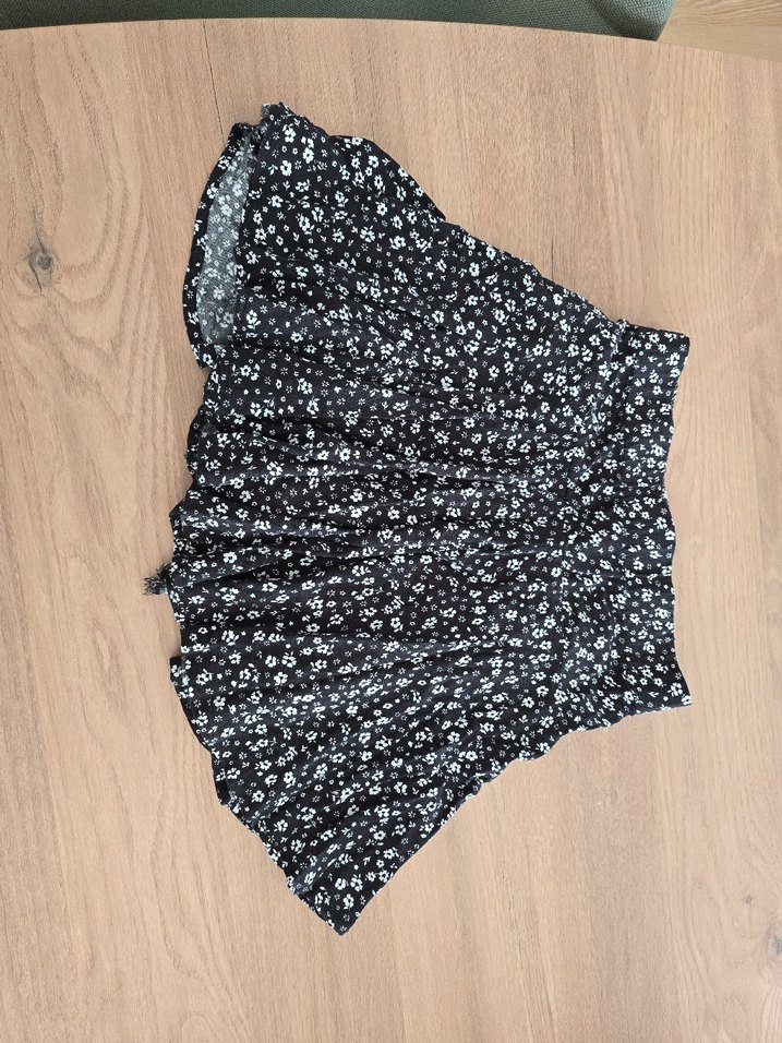 Siyah renkli, küçük çiçek desenli, volanlı ve bol kesim şortlu mini etek.