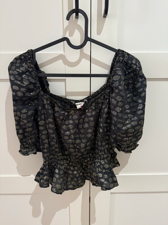 Volanlı ve baskılı desenli siyah, straplez, kısa balon kollu, bol kesim bluz. Romantik akşamlar için uygun.