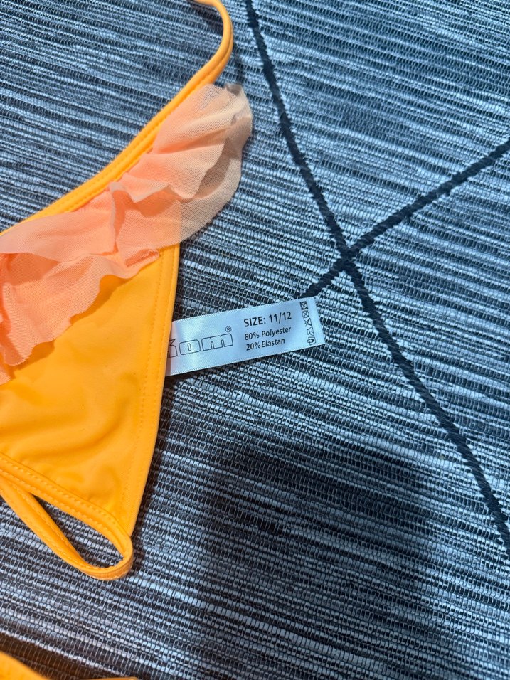 Volan detaylı, turuncu renkli, straplez ve baskılı kısa bikini altı. Sıkı oturan model, plaj için uygundur. Beden 11/12. ️