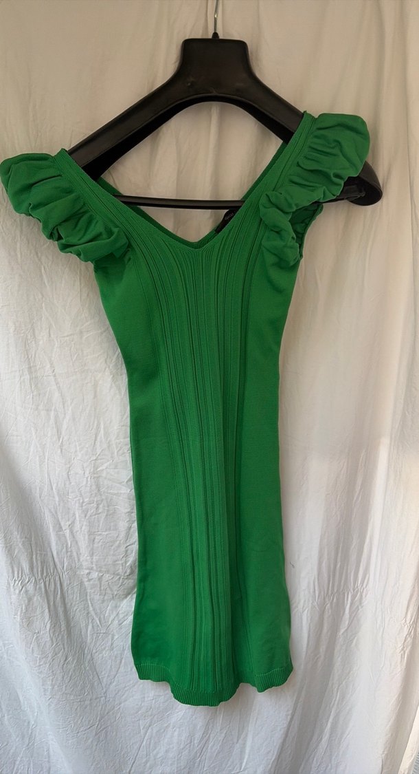 Volanlı kolsuz, V yaka yeşil triko elbise. Midi boyda, sade ve şık dokusu ile sokak modasına uygun.