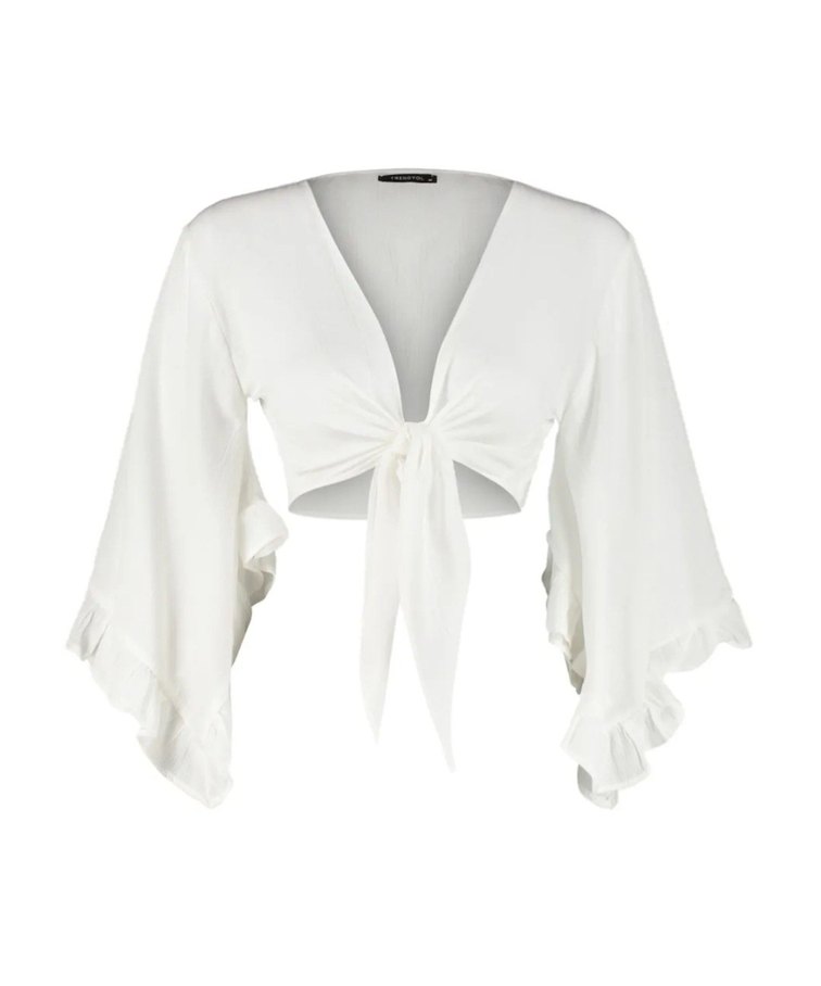 Derin V yaka, ön bağlamalı ve uzun volanlı kollara sahip beyaz keten bluz. Gevşek ve kısa kesimiyle bohem stil . 1 kez kullanildı çok iyi durumda
