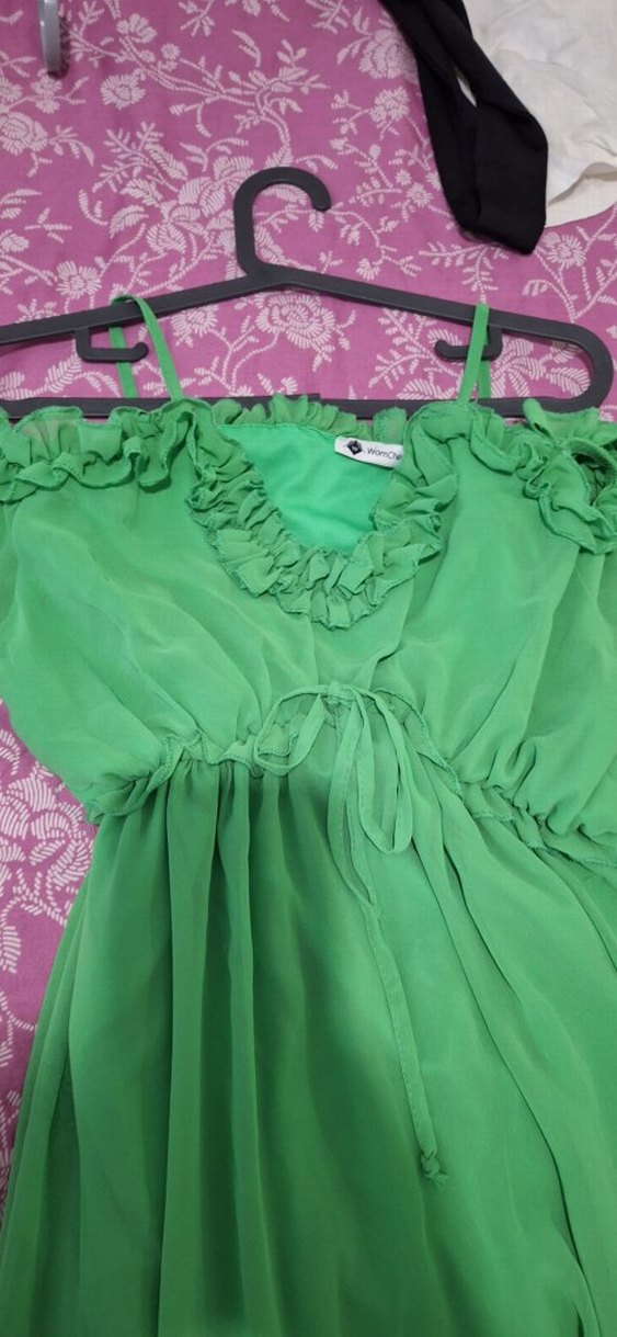Volan detaylı, askısız ve bol kesimli yeşil uzun elbise, bohem tarzını yansıtan renkli bir parça.