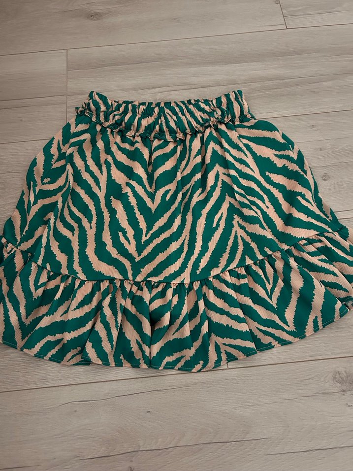 Yeşil zebra desenli mini etek, sentetik kumaştan, bol kesim ve volan detaylıdır. Bohem tarzı ve açık hava kullanımı için uygundur.
