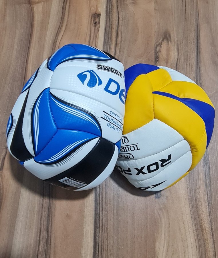 Mavi-beyaz ve sarı-beyaz-mor renklerde, "SWEET" ve "ROX" yazılı iki renkli voleybol topu.