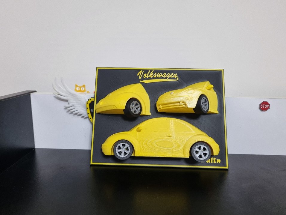 Üç adet parlak sarı Volkswagen oyuncak arabadan oluşan set. Detaylı tekerleklere sahip, canlı renkte modeller. duvara asmalık güzel bişey