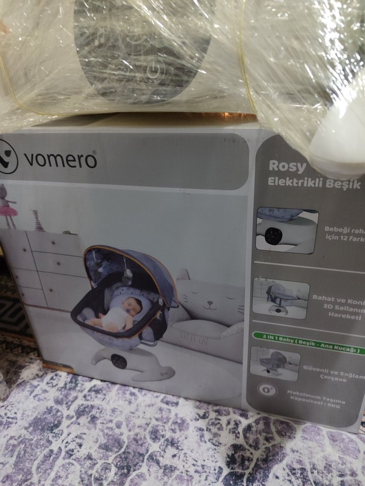 Vomero Rosy elektrikli bebek beşiği, 12 kg'a kadar bebekler için rahat ve güvenli bir uyku alanı sunar. 30 dakikalık zamanlayıcı ve 5 ayarlanabilir sallanma modu bulunur.