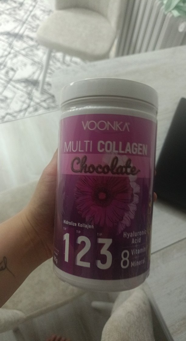 Voonka Multi Collagen çikolata aromalı toz, Tip 1, 2 ve 3 kollajen, hyaluronik asit, C vitamini ve mineraller içerir. kemik cilt saç sağlığına iyi gelir. stok fazlasıdır ambalaji acilmamistir