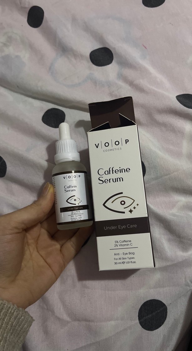 Voop Cosmetics kafein serumu, göz altı bakımı için 5% kafein ve 2% C vitamini içerir. Göz altı torbalarını ve yaşlanma belirtilerini azaltır. Tüm cilt tiplerine uygundur. ✨