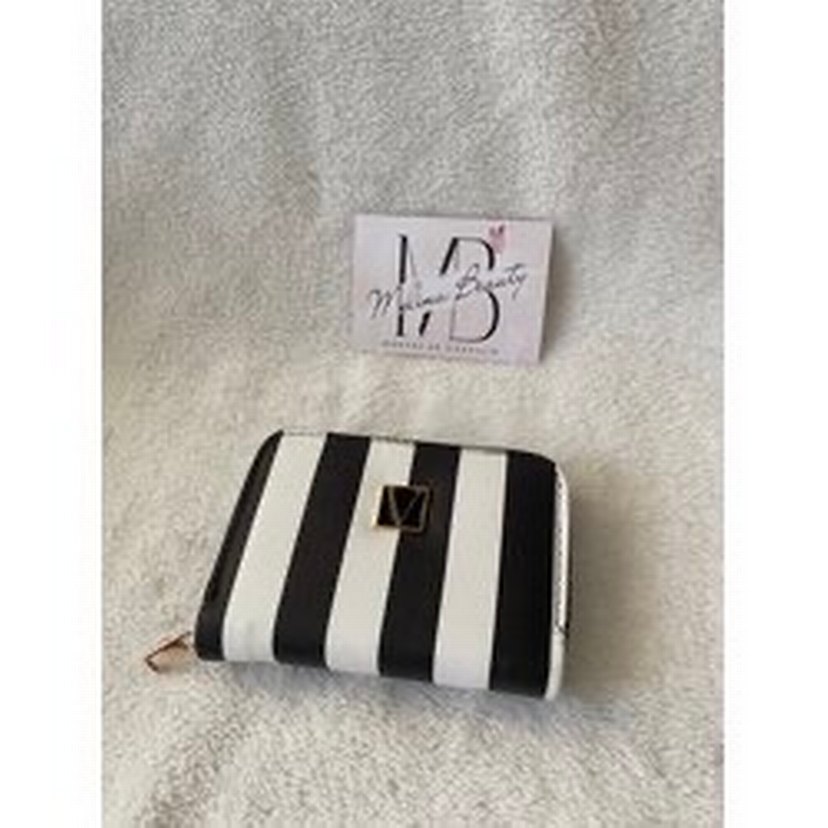 Victoria Secret Bu kadın cüzdanı, parlak deride cesur siyah beyaz zebra deseni taşır. Fermuarlı kapanışı vardır ve Paris tarzı sokak modasına uygundur.