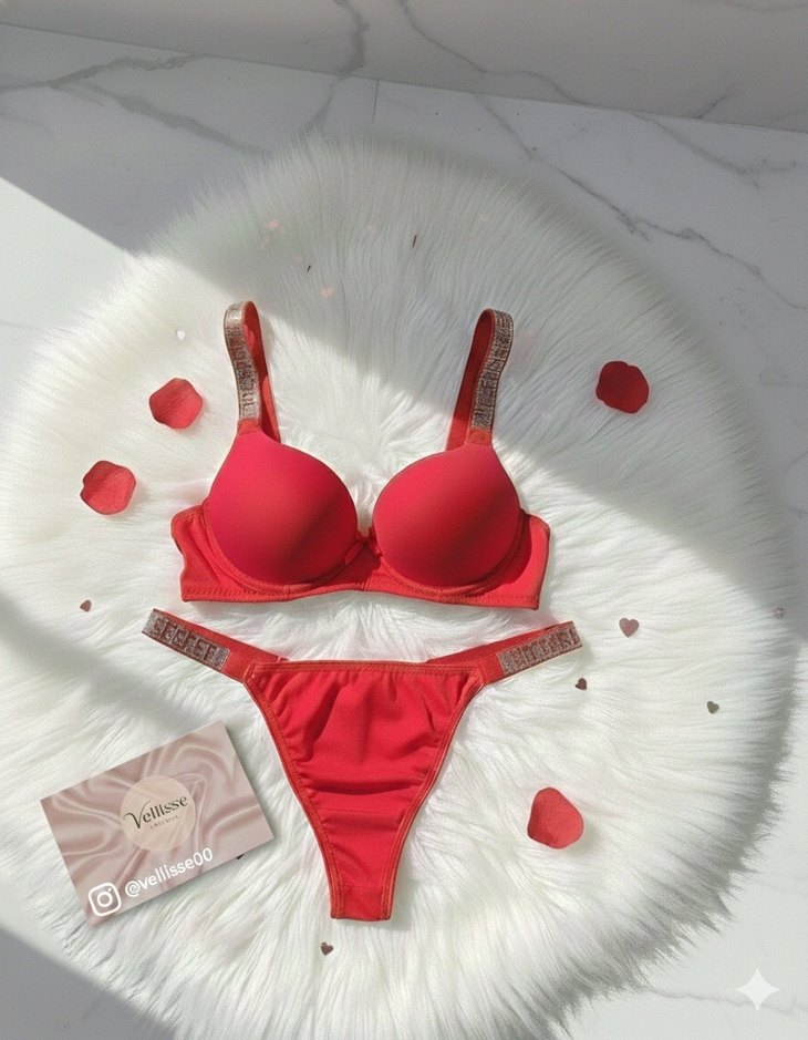 Canlı kırmızı renkli, desen içermeyen sütyen ve mini külot takımı, pop kültürü tarzında ve parlak glamor görünüm sunar. ❤️