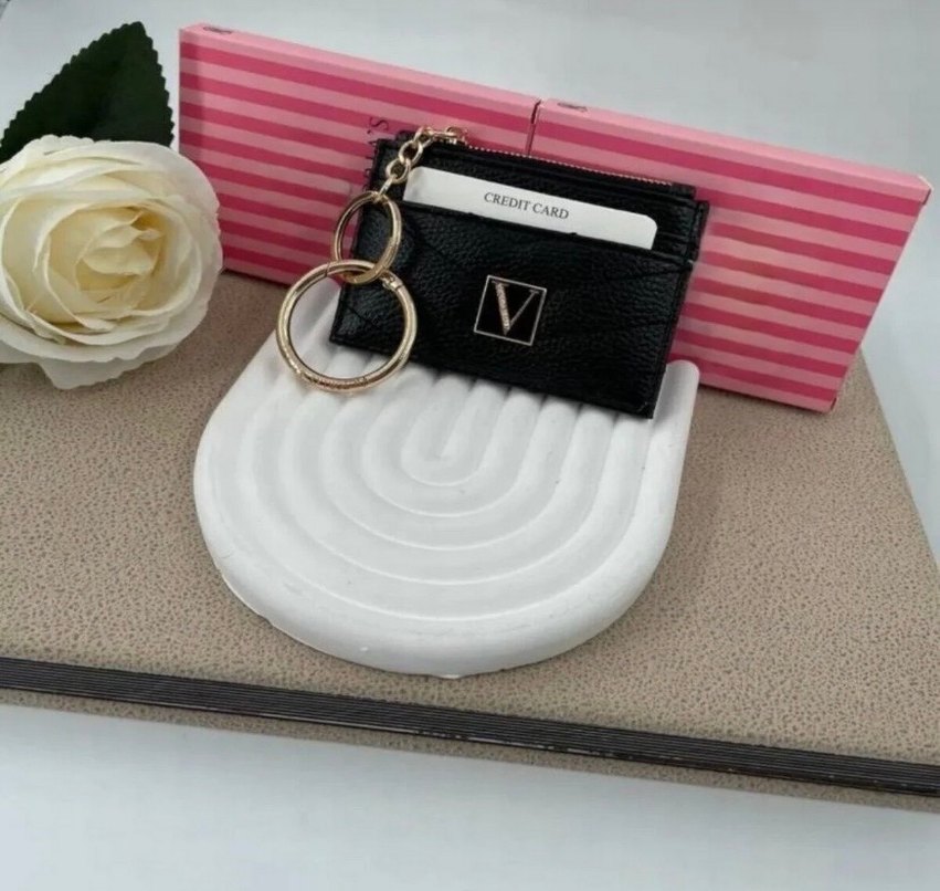 Vs Parlak siyah deri kadın cüzdanı, fermuarlı bölme ve baskılı desen içerir. Anahtarlık ve kartlık özellikleriyle günlük sokak stiline uygundur.