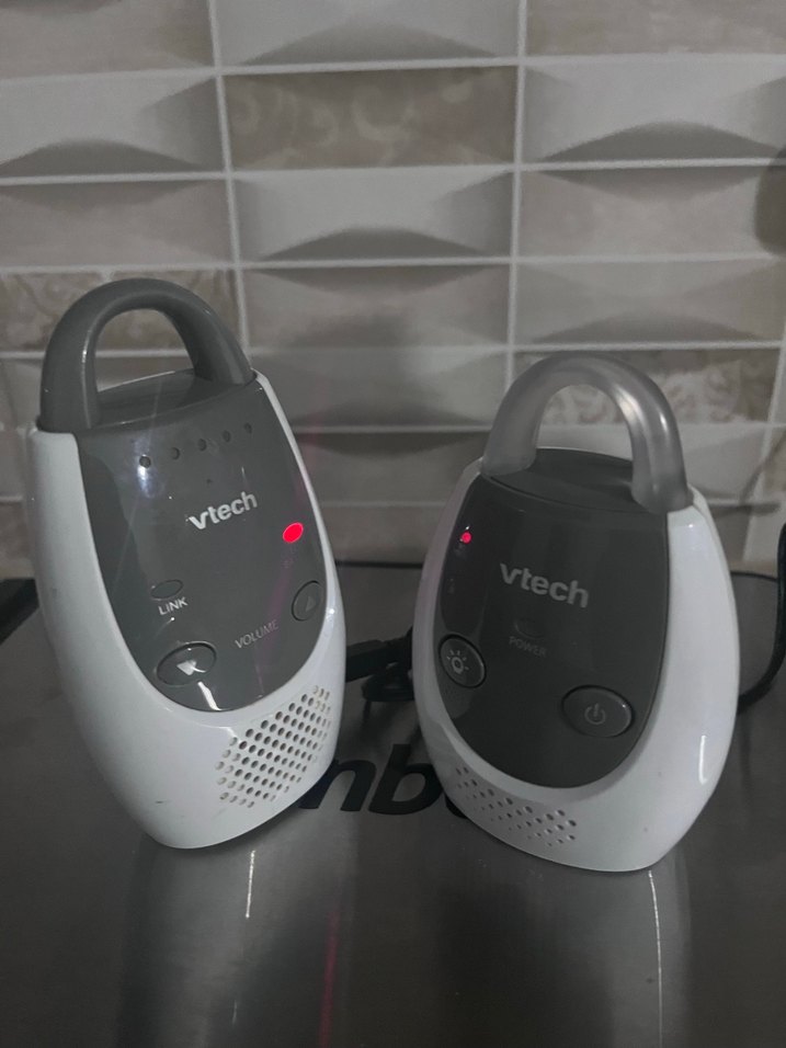 VTech bebek telsizi seti, ses kontrolü ve güç düğmeleri bulunan beyaz-gri iki birimden oluşur, kolay bebek takibi sağlar.