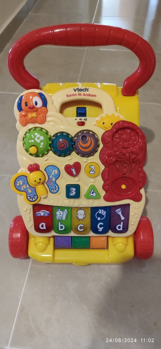 Vtech Benim İlk Arabam renkli bebek yürüteci, etkileşimli düğmeler, dönen dişliler ve müzikli öğeler içerir. Alfabe ve sayı öğrenme parçaları vardır. Ufak bir çatlağı var ama kullanıma engel değildir.