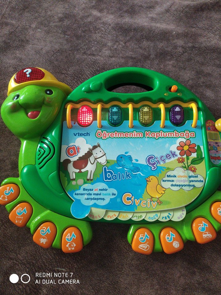 Renkli VTech Öğretmenim Kaplumbağa, harf ve ses öğrenimi için etkileşimli düğmeler ve ışıklı bölümler içeren eğitici kaplumbağa şeklinde oyuncaktır.