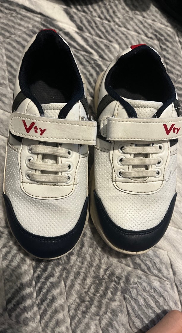 Gri detaylı beyaz erkek çocuk spor ayakkabısı, Velcro bantlı ve kauçuk tabanlıdır. "Vty" logosu bulunur.