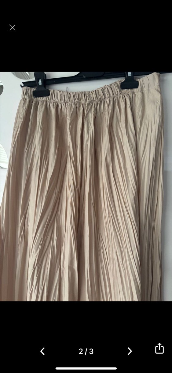 Bej renkli, keten kumaştan yapılmış, pilili ve bol kesim uzun etek. Düz ve desensiz tasarımıyla bohem tarzına uygundur, günlük kullanım için idealdir.