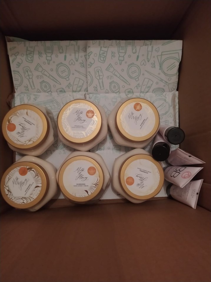 Beyaz ve bej etiketli yuvarlak kaplarda vücut kremleri seti. Cildi nemlendirmek ve beslemek için çeşitli küçük tüpler ve şişeler içerir.