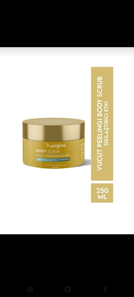 orginx vücut peelingi, cildi ölü deriden arındırır, selülit görünümünü azaltır ve cildi sıkılaştırır. Portakal renkli kutuda. skt:24.01.2026