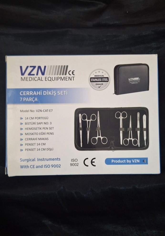 VZN cerrahi dikiş seti, CE ve ISO 9002 belgeli 7 parça medikal kalite paslanmaz çelik aletler içerir. Siyah kutuda düzenli saklama sağlar. ✂️