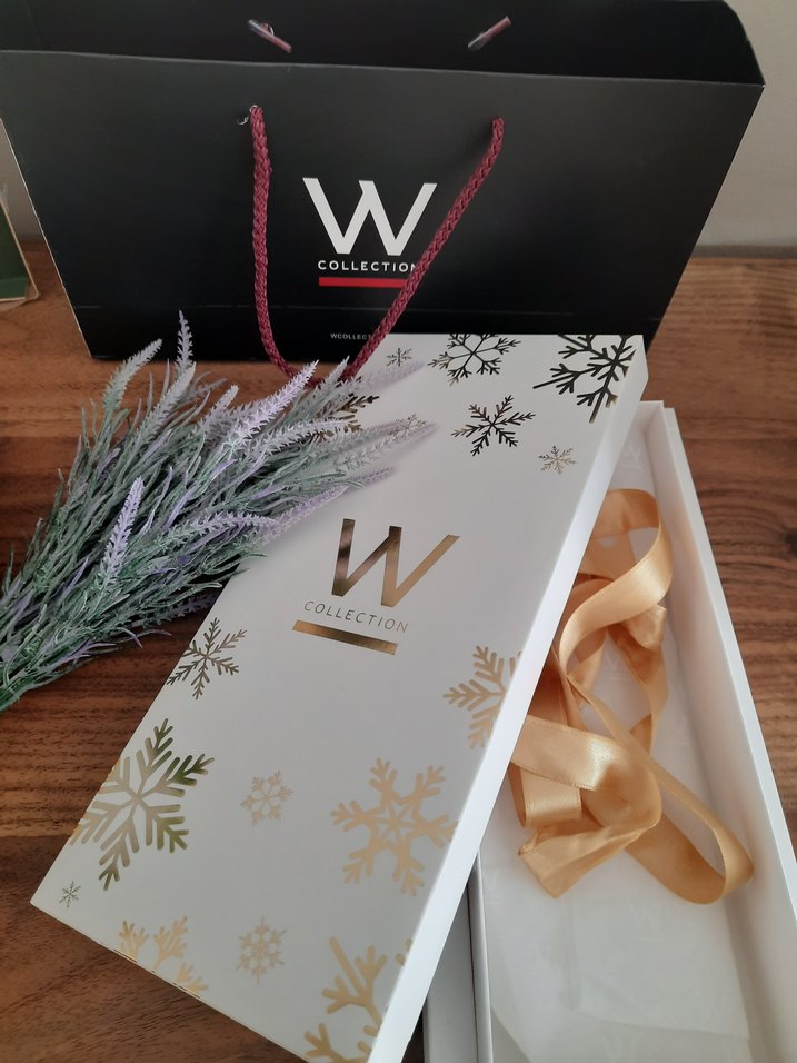 Altın kar tanesi desenli beyaz W Collection hediye kutusu, içinde saten kurdele ve siyah alışveriş çantası ile birlikte.