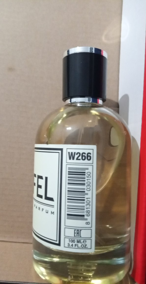 W266 kadın parfümü, 100 ml şişede dengeli ve zarif bir koku sunar. Şişede siyah kapak ve gümüş detay vardır.