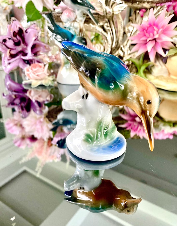 1950-1958 yıllar arası Almanya-Thüringen bölgesinde üretilen, WA Wagner & Apel damgalı, WA 650 seri numaralı soğuk damgalı, kaliteli parlak sırlı porselene sahip, canlı renklerle dekore edilmiş, el boyama, çok şık koleksiyonluk bir yalıçapkını (Kingfisher) kuş biblo. Ölçüler: U12 cm, G6 cm., Y9,2 cm. Ürün kodu: 0697 #biblo #kuşbiblo #wa #WagnerApel #elboyama #vitrinlik #koleksiyon #dekor #nadir #wa650 #çocukodası #dekorasyon #konsol #alman #Thüringen