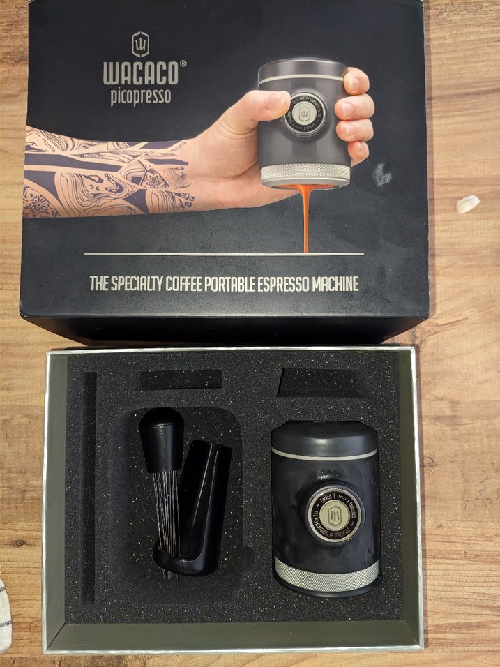 Wacaco Picopresso, siyah renkte taşınabilir espresso makinesi. Özel kahve sevenler için manuel espresso demleme ve aksesuarlar içerir. ☕