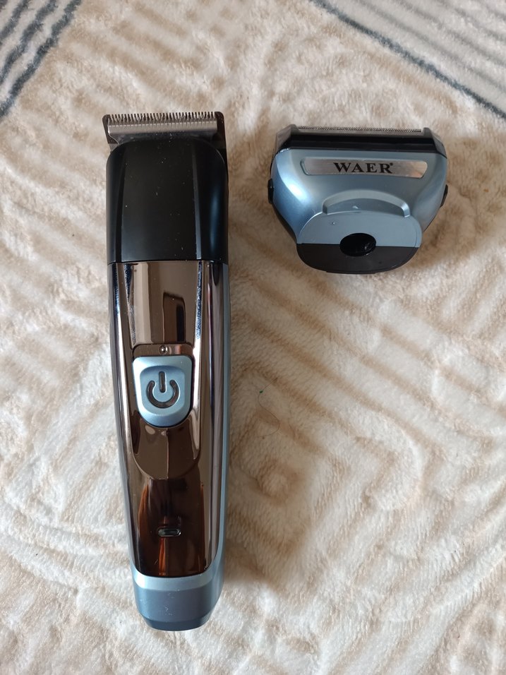WAER gri tıraş makinesi, çıkarılabilir başlık ile çok yönlü kullanım sunar. Güç düğmesi ve şık tasarımı vardır.