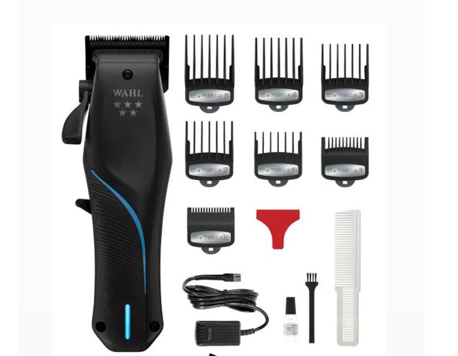 Wahl siyah saç kesme makinesi seti, çeşitli koruyucu taraklar, şarj kablosu, temizlik fırçası ve tarak içerir. Hassas saç kesimi için uygundur. ✂️