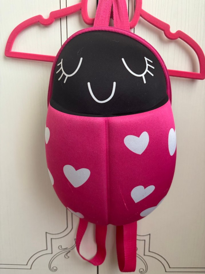 Pembe renginde, üzerinde beyaz kalpler ve gülen yüz deseni bulunan renkli çocuk sırt çantası.
