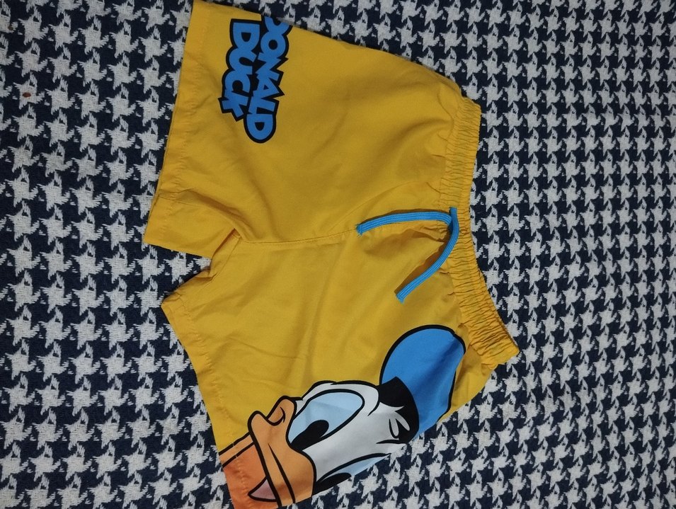 Sarı renkli, elastik bel bantlı ve mavi bağcıklı, renkli Donald Duck baskılı erkek çocuk mayo şortu.