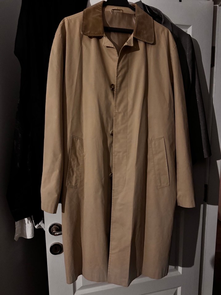 Bej renkli süet erkek trençkot, düğmeli ve kesik yakalıdır. Salaş kesimi ve uzun kollarıyla ofis için klasik şıklık sunar.
